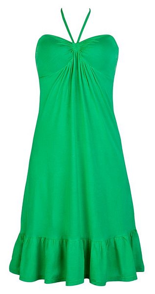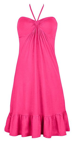 Пляжное платье из вискозы, свободного кроя, низ платья украшает волан, бретель вокруг шеи.