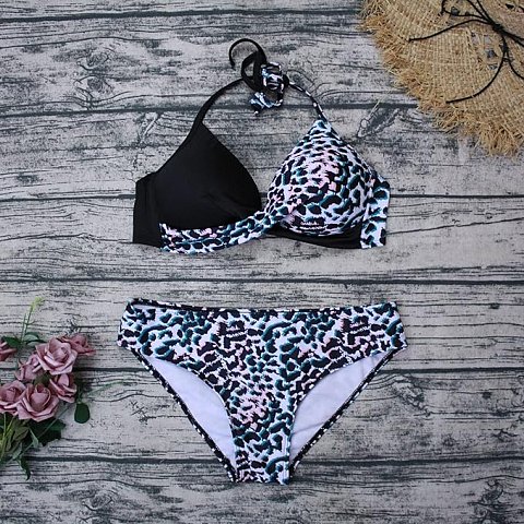 Раздельный купальник с анималистическим принтом и цветными пятнышками. Купальник выполнен из мягкого, быстро сохнущего полотна с принтом. Состоит из бюстгальтера и трусов. Бюстгальтер с формованными чашками без косточек. Обеспечивает комфортную, мягкую посадку. Бретели завязываются вокруг шеи. Застёжка сзади. Трусы средней посадки. В комплекте: лиф, плавки.