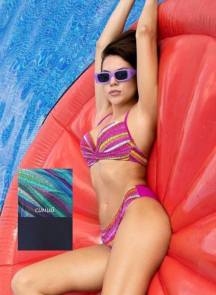 Раздельный купальник: бюстгальтер пуш-ап с формованной чашкой из тонкого поролона и трусики-слип. Бретели на завязке через шею. Застежка на поворотный замок. В комплекте: бюстгальтер, трусики-слипы.