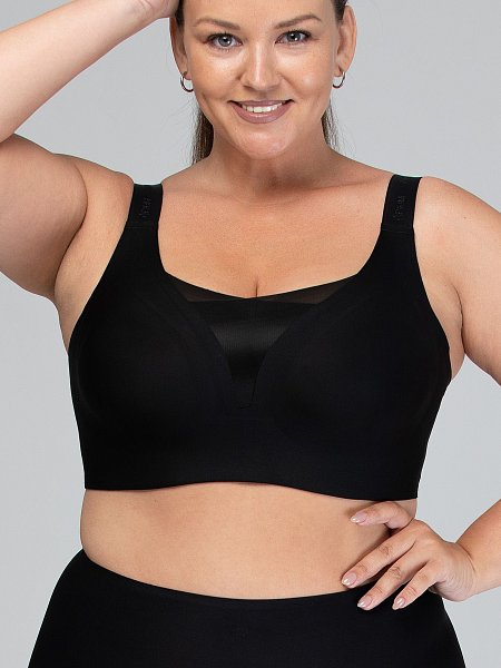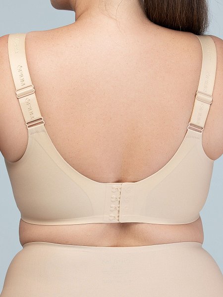 Бюстгальтер без косточек больших размеров разработан специально для женщин с пышной и тяжелой грудью. Закрытые чашки со съемными поролоновыми вставками, широкие регулируемые бретели с вышитым логотипом бренда, широкие боковые детали, застежка на крючки 4х4. Бюстгальтер бесшовный, не имеет жестких деталей, поэтому отличается повышенным комфортом, при этом надежно фиксирует грудь. Идеально подходит для длительной повседневной носки и активного времяпровождения.