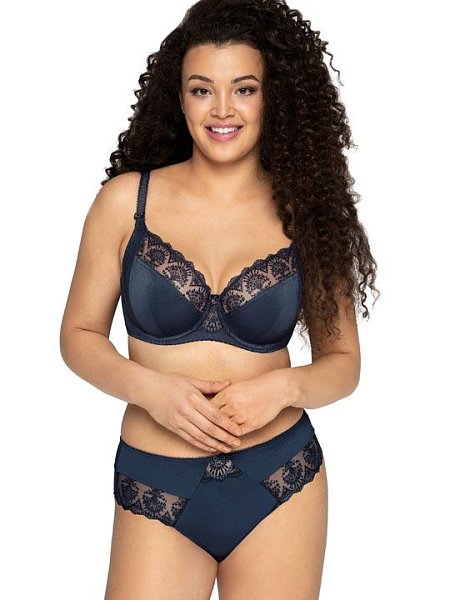 Бюстгальтер на косточках, с дополнительными боковыми поддержками, чашки мягкие, шитые из гладкого трикотажа, верхняя часть чашки из сетки с вышивкой, бретельки не отстёгиваются, регулируются. На спине застёжка на удлинитель.