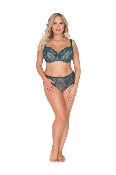 Бюстгальтер выполнен на косточках, с боковыми поддержками, чашки мягкие шитые из кружева цвета изумруд с Т-образным швом и боковым подкроем, чашки и спинка продублированы телесной сеткой. Бретельки пришиты, регулируются по длине, на спине застёжка - удлинитель на крючках, фурнитура металлическая крашеная.