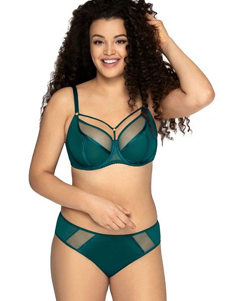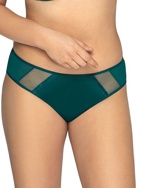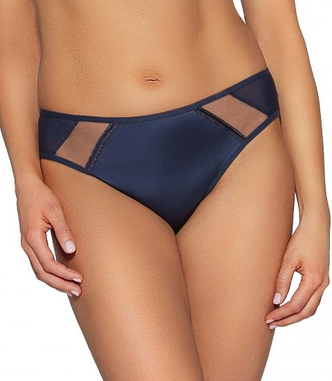 Трусики-бразилиана спереди из эластичного трикотажного полотна со вставками из сетки, спинка из эластичного трикотажного полотна и сетки, сложенной вдвое. Утонченный шарм придают атласные ленты, отороченные разноцветной блестящей нитью. Ластовица проложена 100% хлопком.