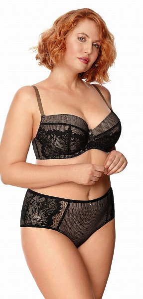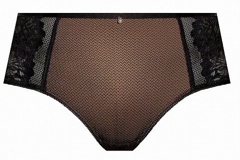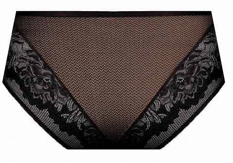 Трусики-слип с высокой линией талии из сетки, продублированной сеткой цвета бронзы, спереди по бокам и на спинке вставки из кружева. Ластовица проложена 100% хлопком.